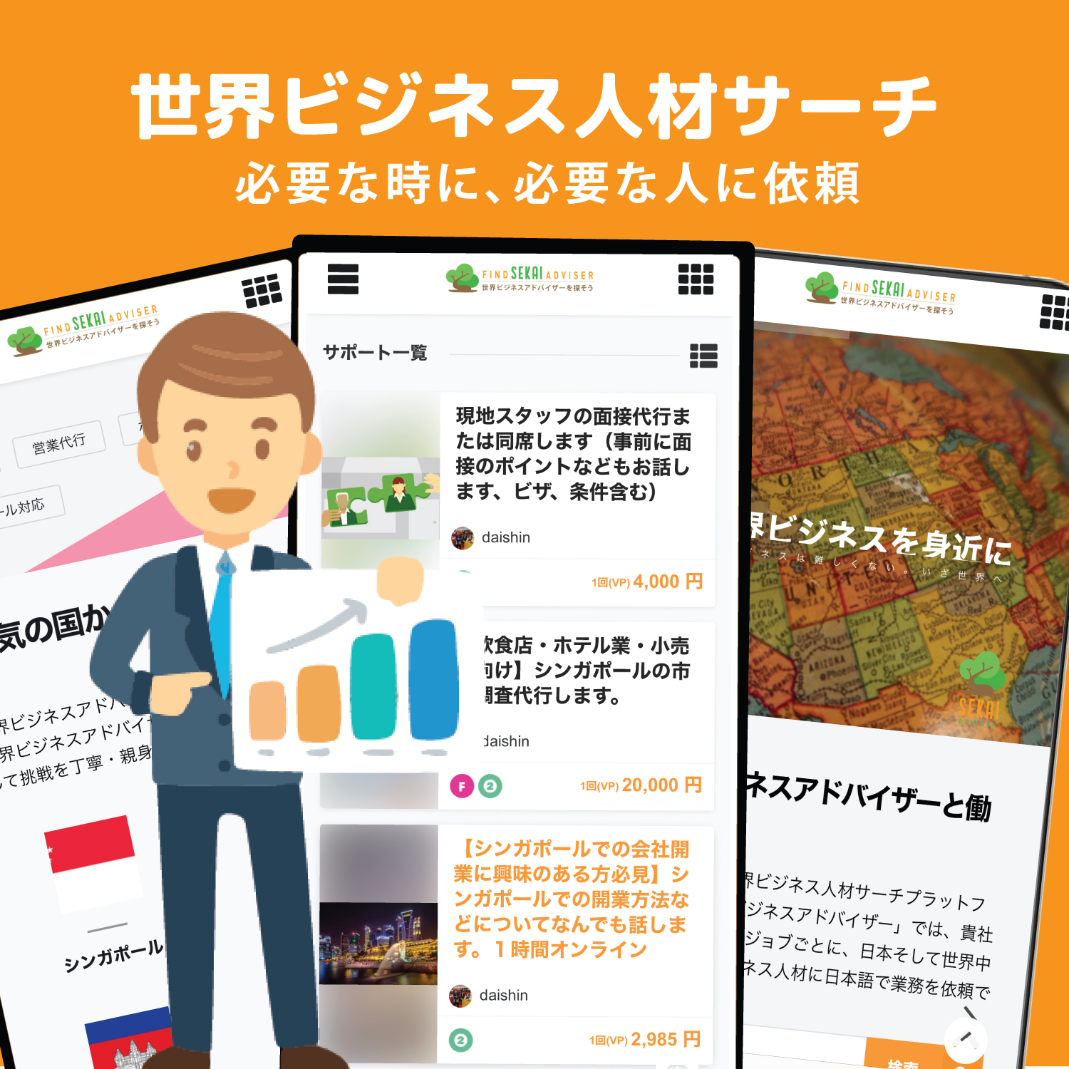 もちろん、世界アドバイザーの方々は日本語対応できる方のみご登録頂いておりますので、海外進出が初めての企業様でも安心してご相談頂けます。
